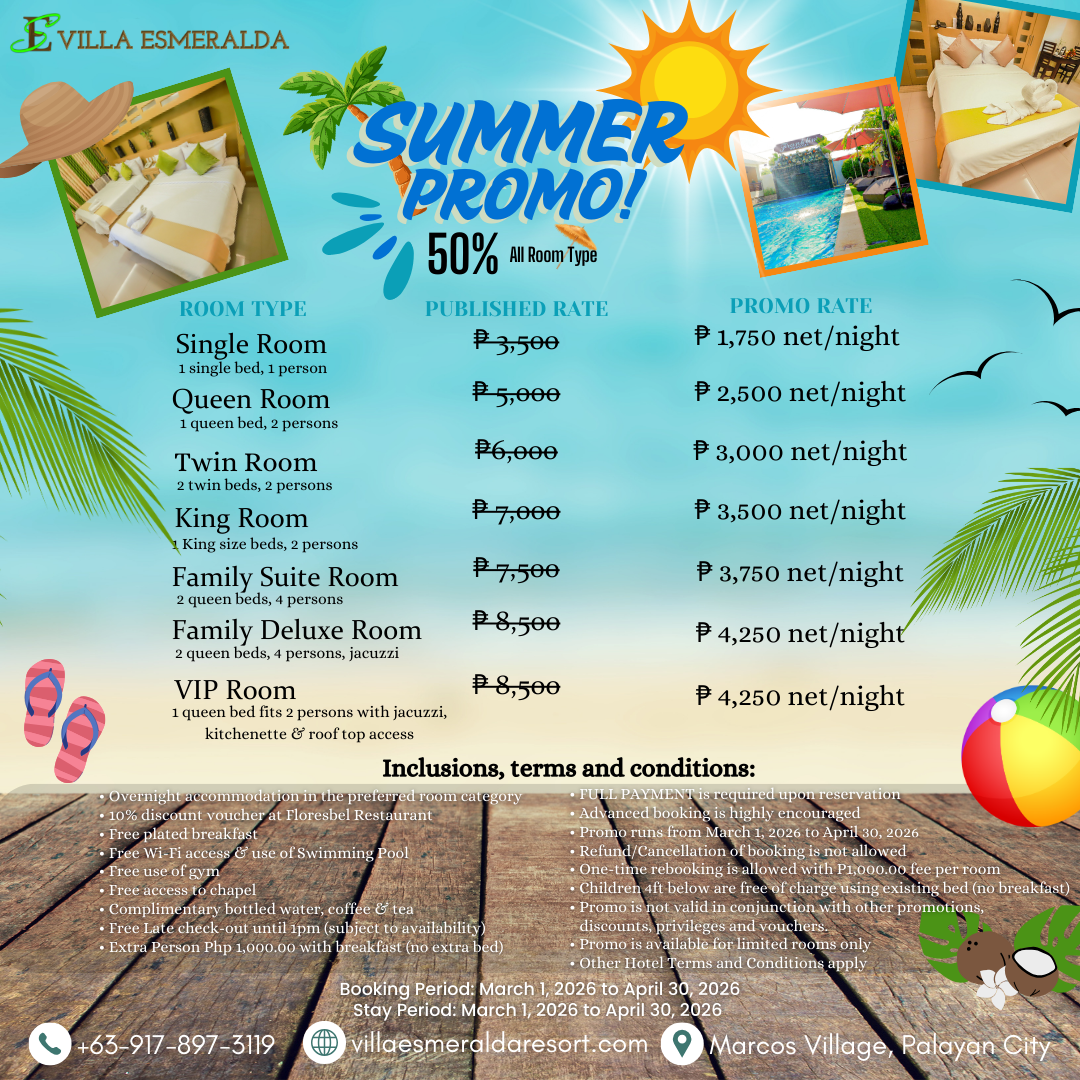 Also, at Villa Esmeralda Resort, we offer affordable and all-in rates that already include lodging and free use of all our amenities such as swimming pool, gym, flat screen TV’s with cable, stove, refrigerator, hot and cold water dispenser etc.. NO HIDDEN FEES!